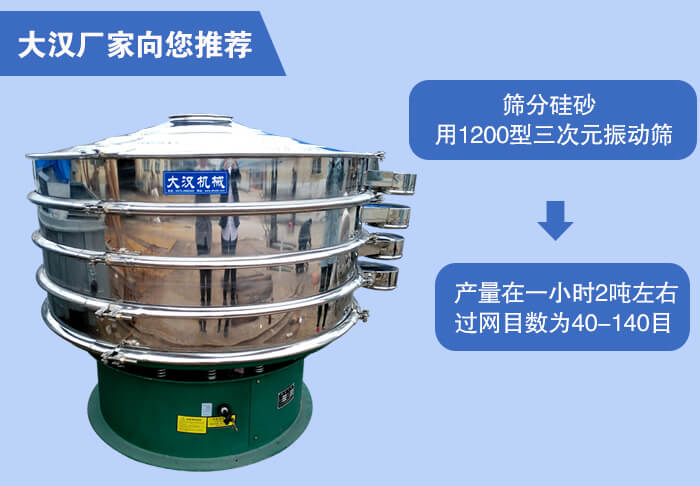 近期有客戶詢問(wèn)我們銷售客服問(wèn)篩分烘干后的硅砂產(chǎn)量在一小時(shí)2噸左右,過(guò)網(wǎng)目數(shù)為40-70目、70-140目適合用什么型號(hào)的振動(dòng)篩,小編根據(jù)客戶所篩分的物料與過(guò)網(wǎng)數(shù)目和產(chǎn)量推薦使用1200型三次元振動(dòng)篩
