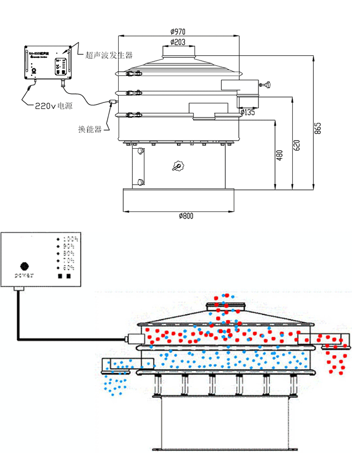 超聲波振動(dòng)篩結(jié)構(gòu)和旋振篩機(jī)構(gòu)相同,只不過是在旋振篩的基礎(chǔ)上加裝了超聲波振動(dòng)裝置。超聲波振動(dòng)裝置可以使超聲波振動(dòng)篩的篩分效率高出很多。