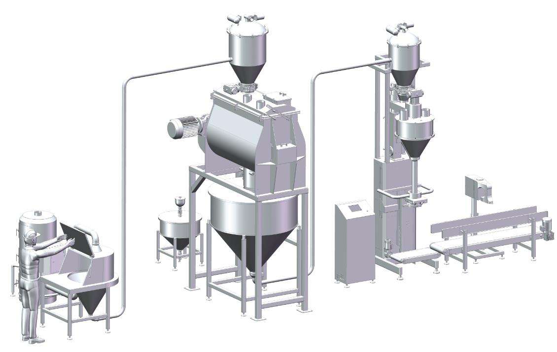 當(dāng)小袋物料需要拆包倒入下道工序時(shí),只需人工直接拆包放入系統(tǒng)即可。給料過程中產(chǎn)生的物料粉塵由除塵風(fēng)機(jī)收集。物料通過振動(dòng)篩(安全篩)攔截散狀物料和異物,保證符合要求的顆粒順利輸入。
