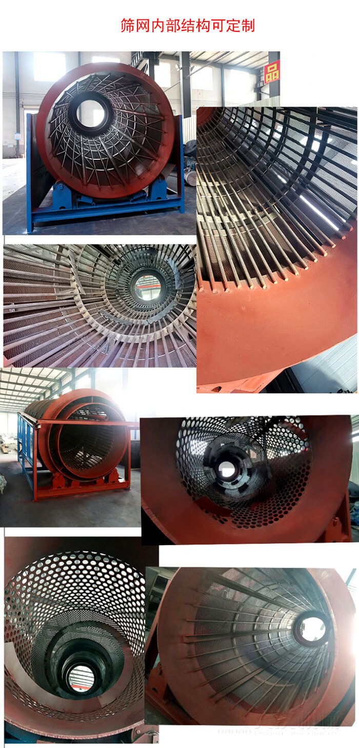 當(dāng)物料進(jìn)入重型滾筒篩內(nèi)部篩網(wǎng)時(shí),由于滾筒裝置的傾斜與轉(zhuǎn)動(dòng),使篩面上的物料翻轉(zhuǎn)與滾動(dòng),使合格物料(篩下產(chǎn)品)經(jīng)滾筒外圓的篩網(wǎng)排出,不合格的物料(篩上產(chǎn)品)經(jīng)滾筒末端排出。由于物料在滾筒內(nèi)的翻轉(zhuǎn),滾動(dòng),使卡在篩孔中的物料可被彈出,防止篩孔堵塞。
