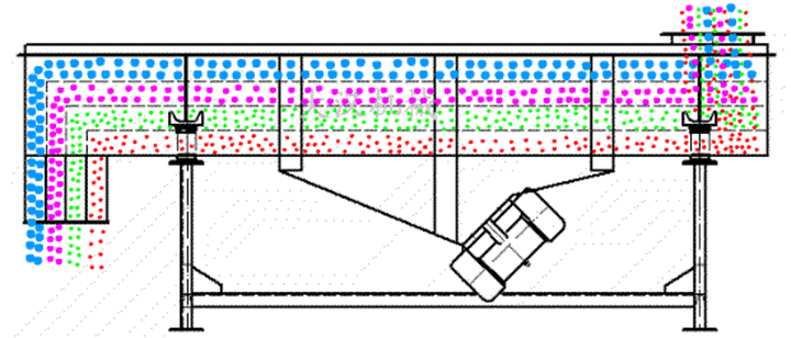 粉煤灰振動利用振動電機激振作為振動的振動來源,使物料在篩網(wǎng)拋起,同時向前作直線運動,物料從給料均勻地進入振動篩機的進料口,通過多層篩網(wǎng)網(wǎng)孔大小的不同控制物料顆粒的大小,從而保證不同的物料在不同層級中被排出篩箱外。