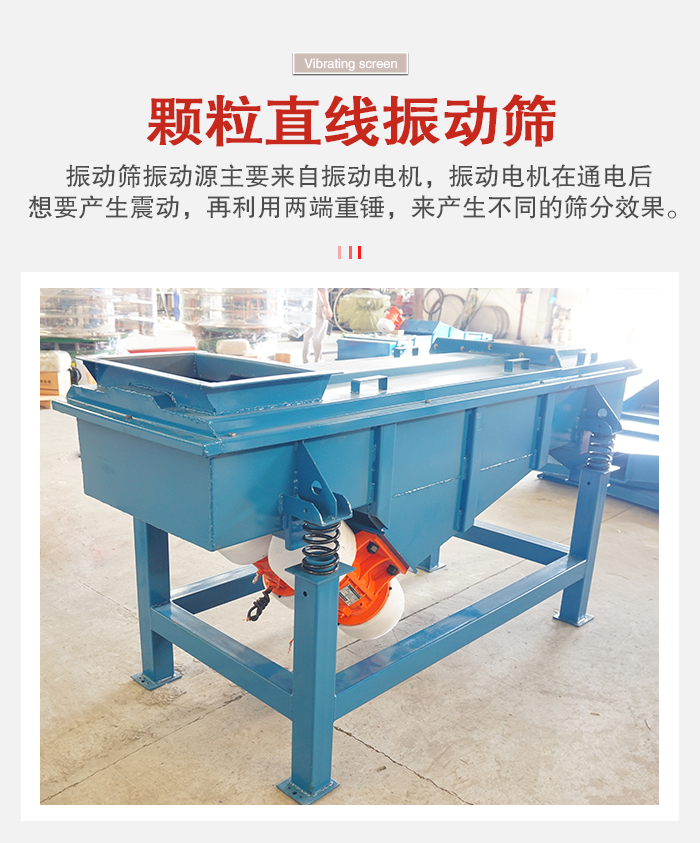 顆粒振動(dòng)篩根據(jù)篩分原理主要分圓形和方形兩種結(jié)構(gòu),振動(dòng)篩振動(dòng)源主要來自振動(dòng)電機(jī),振動(dòng)電機(jī)在通電后想要產(chǎn)生震動(dòng),再利用兩端重錘,來產(chǎn)生不同的篩分效果。